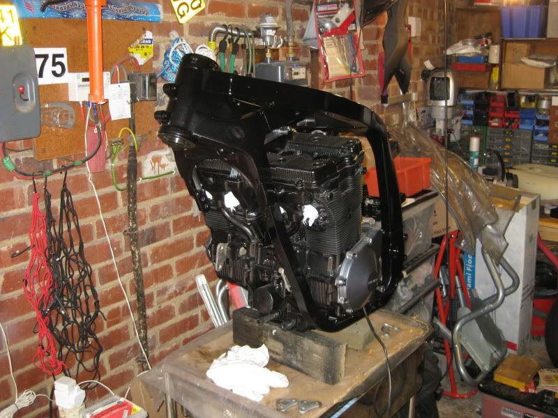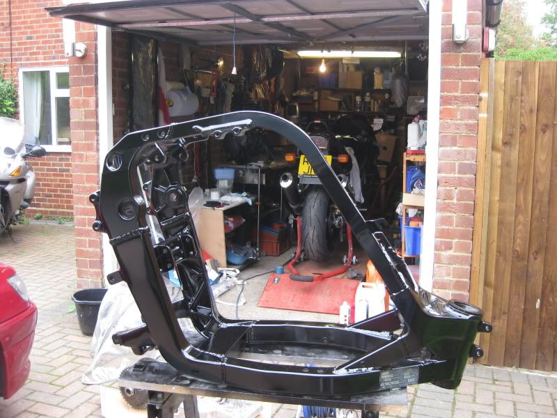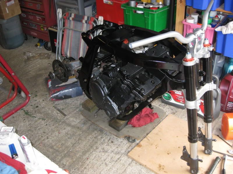 With the engine back together it was time to look at the frame. I didn't want to spend more money on the frame as it may well be replaced. I had suspicions that it had been in an accident some time ago as the subframe appeared to have been replaced with some of the worst welding I have ever seen. This welding was meant to be removed when the lugs were put on but due to a misunderstanding the lugs were welded to it instead. A load of filler over the bad welding meant that powder coating the frame was not an option as the filler can crack at the temps used in the process apparently. The frame is a bit tatty with some corrosion etc so I ended up rubbing it down, cleaning it up a bit and just doing a "that'll do for now" blow over with some engine enamel.