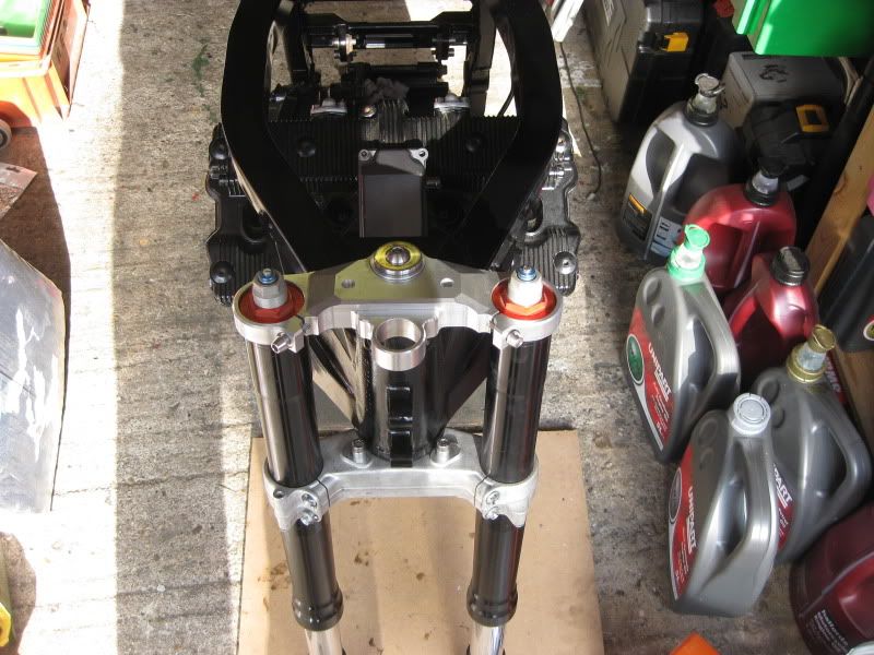 Now upon seeing the engine in the frame it started looking a little like a bike again. I got my neighbour to help lift the frame and engine down onto a trolley and the front end went on next. The front end consists of a pair of Aprilia Falco forks and bottom yoke with a Tuono top yoke and risers, a set of Brembos from an RSV and KTM fat bars. The wheel at the mo is RSV brembo but a Ducati 916 wheel will match the Triumph rear and give me a speedo drive should I want to use one.