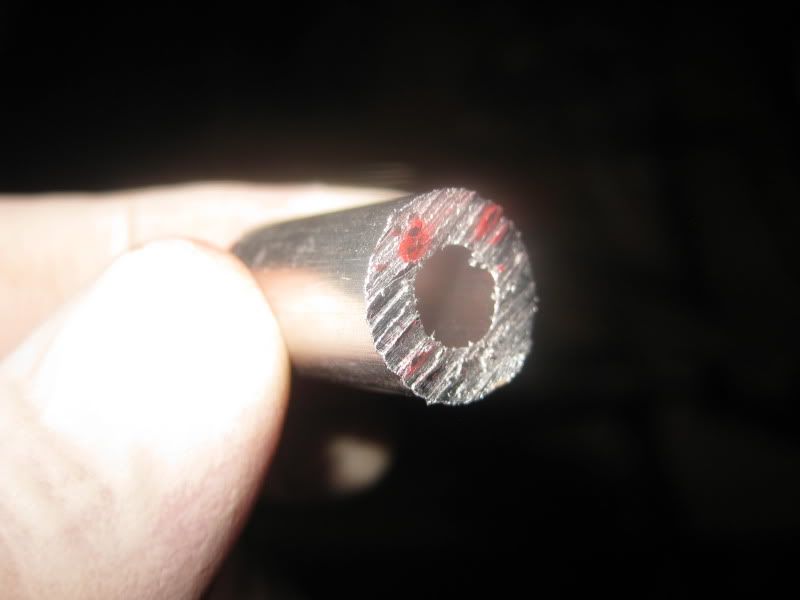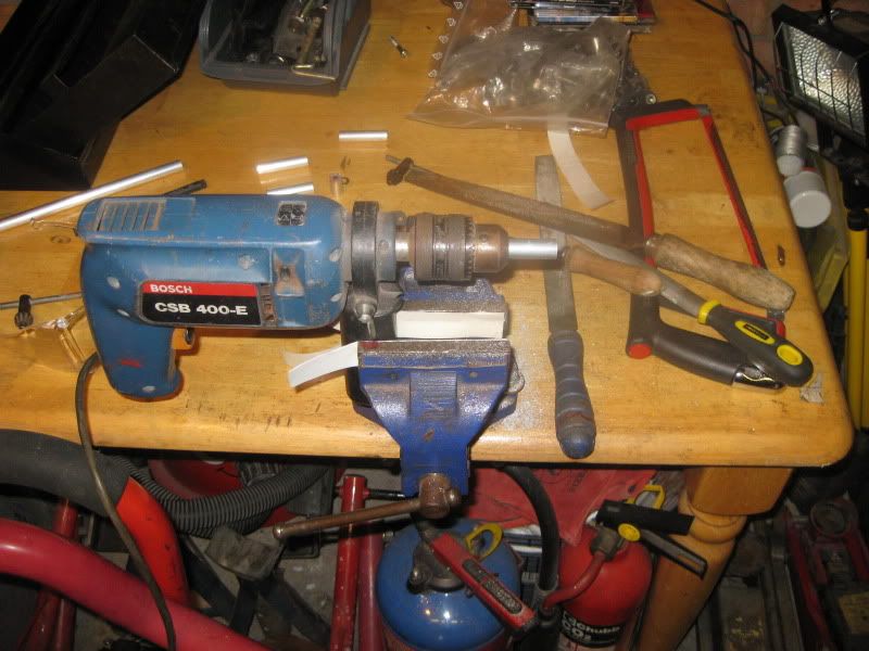 Next up was a clutch slave cylinder holder/sprocket cover bought cheap off ebay as it had no spacers or bolts. I had previously emailed Pete Stansfield as he had one for sale on ebay and got the measurements of the spacers and then bought a length of 12mm ally tube and cut it to approximate lengths. Not having a lathe, I stuck these lengths in an electric drill clamped in the vice and stuck a file on the end until they were the right lengths. This also squared them up as I can't cut straight with a hacksaw.